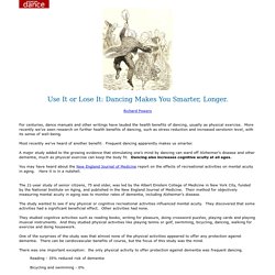 Use It or Lose It: Dancing Makes You Smarter Musings by Richard Powers For hundreds of years dance manuals and other writings have lauded the health benefits of dancing, usually as physical exercise. More recently we've seen research on further health benefits of dancing, ... Retrieve Full Source